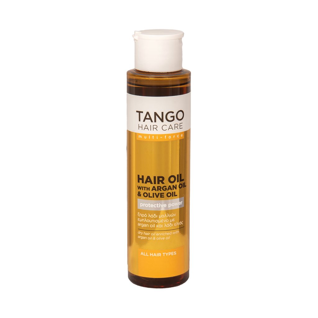 Το Tango hair oil, εμπλουτισμένο με λάδι argan & λάδι ελιάς, χαρίζει λάμψη στα μαλλιά και τα κάνει μεταξένια και απαλά, ενώ τα προστατεύει από το φριζάρισμα και να διευκολύνει το χτένισμα. Η σύνθεσή του είναι ανάλαφρη και μη λιπαρή για να ταιριάζει σε κάθε τύπο μαλλιών και να μπορεί να χρησιμοποιηθεί καθημερινά.