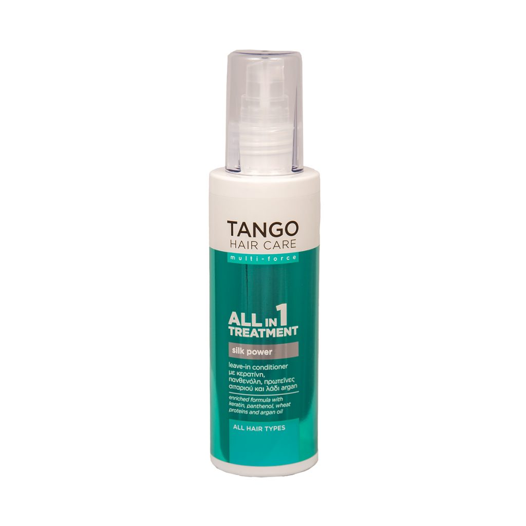 To Tango All in 1 treatment σε μορφή spray είναι μια θεραπεία κατάλληλη για όλους τους τύπους μαλλιών με πολλαπλές δράσεις. Με εμπλουτισμένη σύνθεση με κερατίνη, πανθενόλη, πρωτείνες σιταριού και λάδι argan 1)Επανορθώνει τα ξηρά και ταλαιπωρημένα μαλλιά 2) Προσφέρει ενισχυμένη ενυδάτωση, μειώνοντας την ξηρότητα και τη θαμπάδα τους 3) Ξεμπερδεύει τα μαλλιά και διευκολύνει το χτένισμα 4) Χαρίζει απαλή και μεταξένια υφή 5)Προσφέρει έλεγχο κατά του φριζαρίσματος 6) Προσφέρει δυνατά και λαμπερά μαλλιά 7) Προστατεύει από τη θερμότητα 8) Προστατεύει το χρώμα 10) Χαρίζει διάρκεια στο styling 11) Ενισχύει τον όγκο και παρέχει προστασία ενάντια στις σπασμένες άκρες.