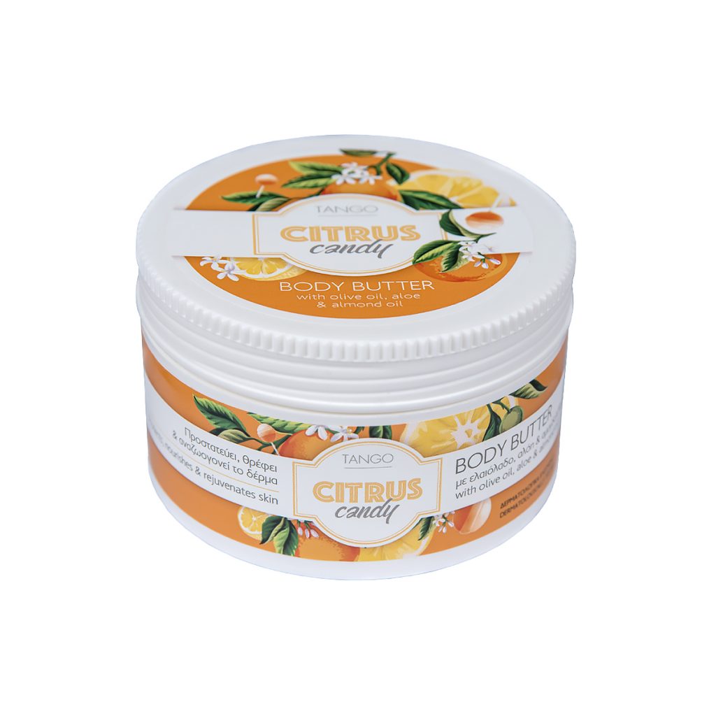 Η γλύκα της καραμέλας και η φρεσκάδα των εσπεριδοειδών συμπυκνωμένα σε αυτό το πλούσιο βούτυρο σώματος που θα αφήσει το δέρμα σας εξαιρετικά ενυδατωμένο, μαλακό και μεταξένιο χωρίς ίχνος λιπαρότητας. Απορροφάται εύκολα, προστατεύει βαθιά, θρέφει κι ανανεώνει το δέρμα, ειδικά σε δύσκολα σημεία όπως οι φτέρνες και οι αγκώνες. Με σύνθεσή του περιέχει πάνω από 92% φυσικά συστατικά και βιταμίνες όπως η αλόη, γνωστή για τις καταπραϋντικές τις ιδιότητες, η βιταμίνη Ε με έντονη αντιοξειδωτική κι ενυδατική δράση, το βούτυρο καριτέ (shea butter) που ενυδατώνει και σφραγίζει την υγρασία, το ελαιόλαδο και το αμυγδαλέλαιο πλούσια σε θρεπτικά κι αντιοξειδωτικά συστατικά.