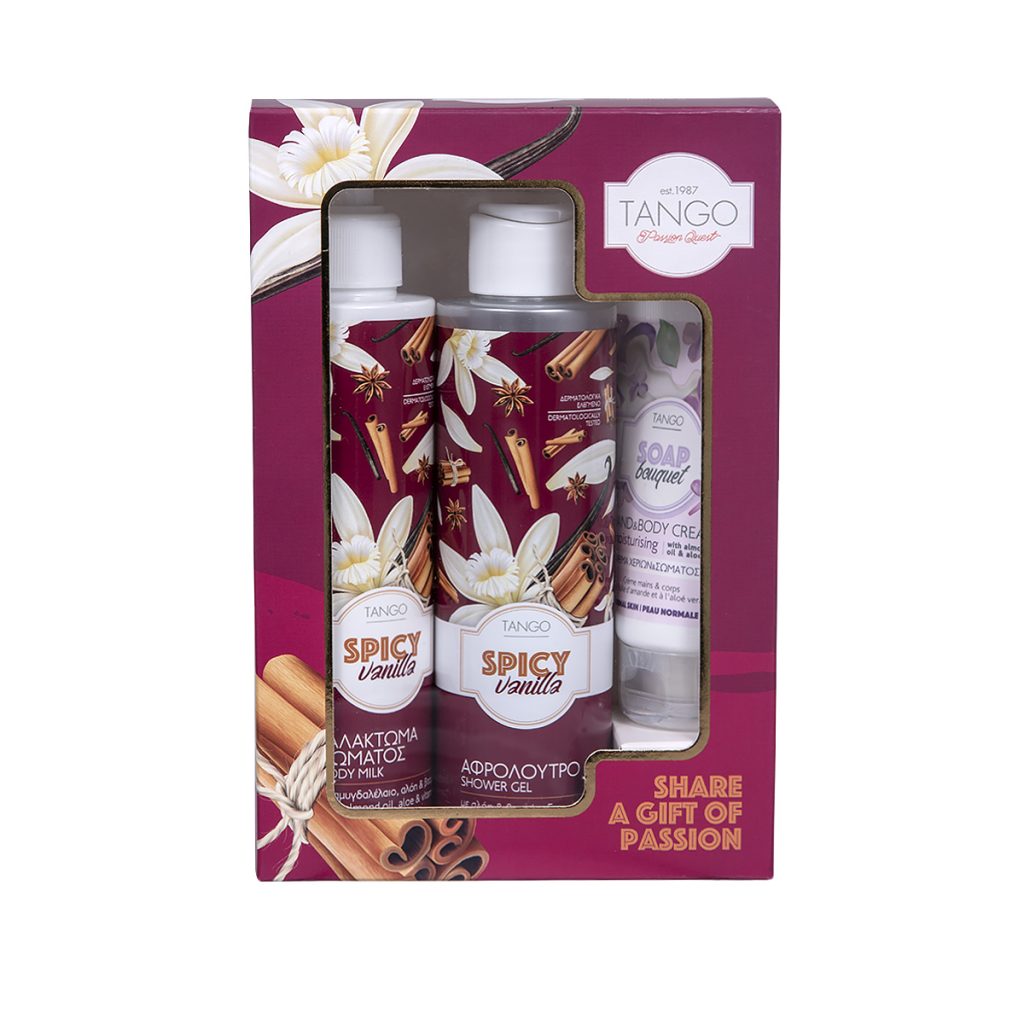 Ένα υπέροχο δώρο είτε για εσάς είτε για τους αγαπημένους σας με τα προϊόντα περιποίησης σώματος Tango για μια αίσθηση πάθους και της γιορτινής εμπειρίας που χαρίζουν τα αρώματα της βανίλιας και της κανέλλας.